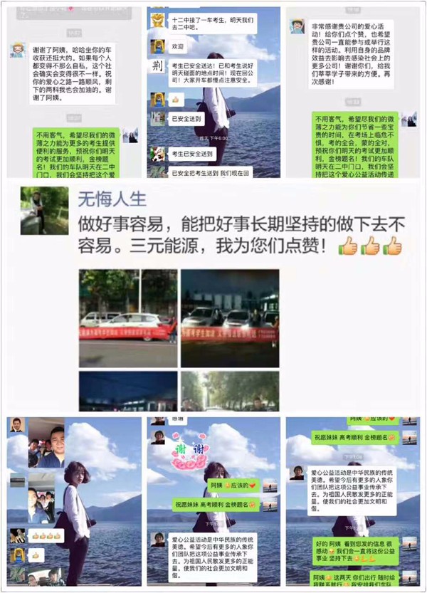 三元人懷揣著激動而又心安的心情,此屆愛心***公益活動***結(jié)束在此,也感謝所有三元能源的家人們,謝謝你們這兩天辛勤地的付出,同時讓每一位三元人也切身體會到的更多的是滿滿的感動和愛。兩天雖短,卻讓我們收獲頗豐,更得到了社會各界的支持和贊譽,尤其是來自考生和家長發(fā)自肺腑的感謝和真摯的祝福期間所有感動的瞬間,大愛的流露太多太多!期間我們遇到了一位家長,她的一雙兒女,兩年都是分別被我們車隊接送,今年是她的女兒;我們一大早六點就起來在新鄉(xiāng)市公交站牌、小區(qū)門口等候接送,家長知道我們起得早,第二天考試直接給我們準備了一大袋的鹵雞蛋,說句心里話,這一次是我們吃過***好吃的鹵蛋…等等…太多太多的感人事跡和關(guān)于愛和緣分的故事很慶幸擁有三元能源這個大家庭,也很慶幸每一位三元人都能真正靜下心來去踐行這份公益事業(yè),同時我們?nèi)茉垂靖鼤远ú灰频匕堰@份愛心公益活動傳承下去***后,祝愿所有2017年的高考生們:愿你們合上筆蓋的那一刻,有武士將刀收回劍鞘般的驕傲未來,我們一起加油!
